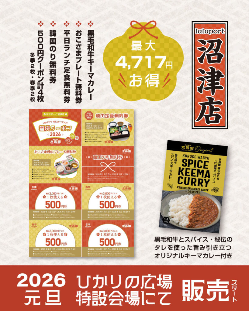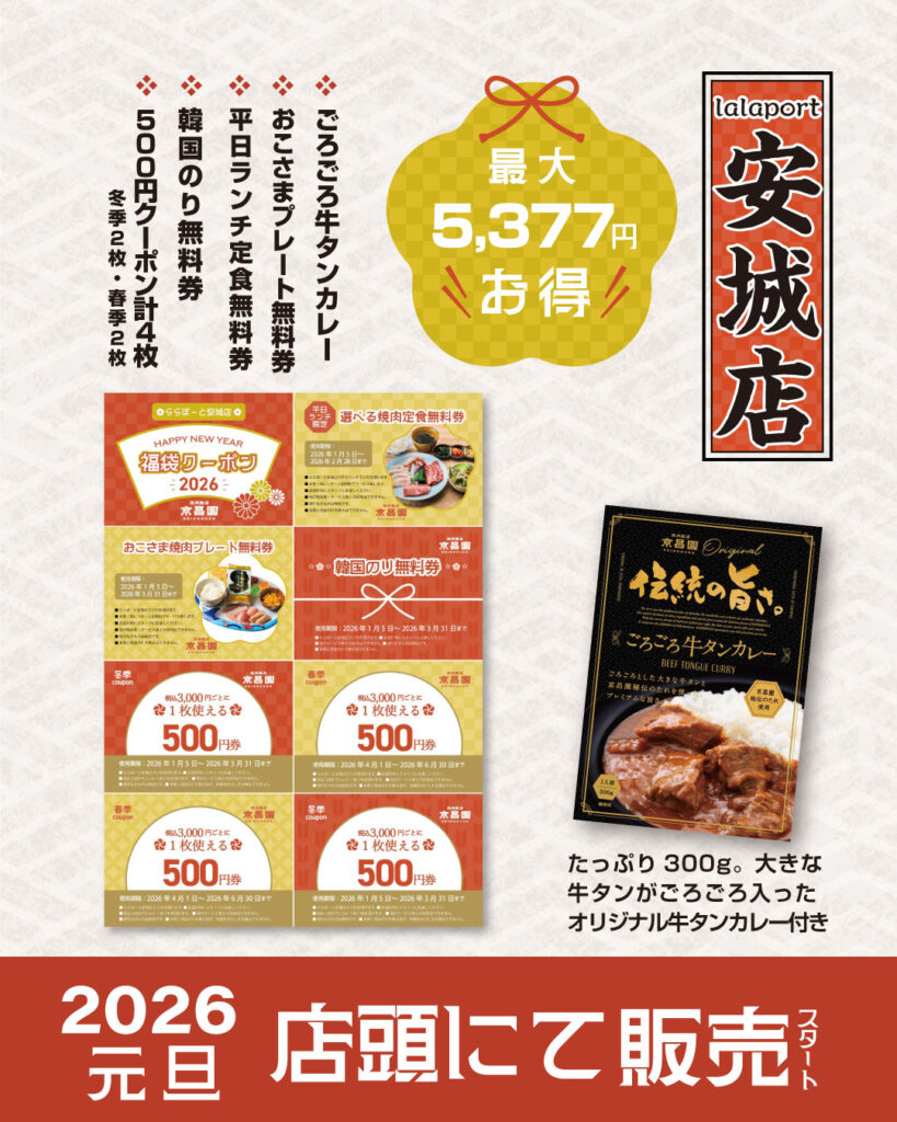 7枚のクーポン+京昌園オリジナルカレー(税込1080円)付きで税込1,000円!両店、2026年元旦より下記会場で販売いたします。